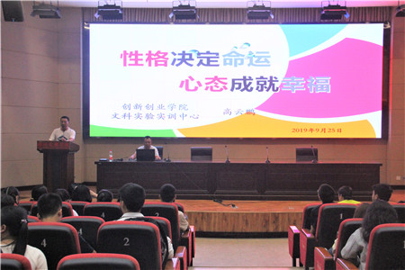 9月25日19:00,文科实验实训中心教育心理实验室主任高云鹏老师在莲湖校区学术报告厅A厅作了题为“性格决定命运,心态成就幸福”的学术讲座,本次讲座由william英国中文院长文武教授主持,william英国中文老师及教师教育学院近200名学生到场聆听。