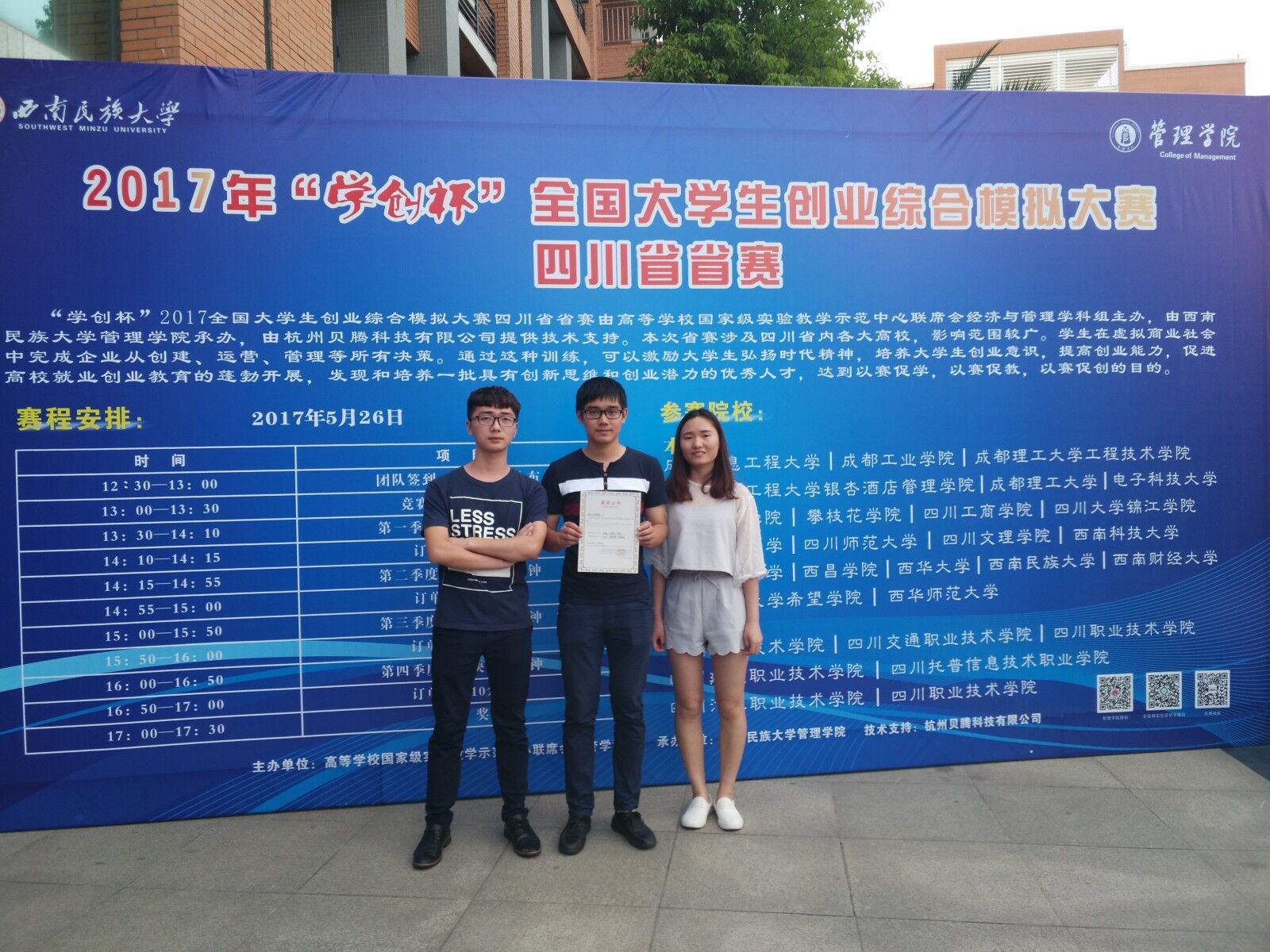 2017526,由高等学校国家级实验教学示范中心联席会经管学科组主办、西南民族大学管理学院承办的2017“学创杯全国大学生创业综合模拟大赛四川省选拔赛在西南民族大学航空港校区拉开帷幕。williamhill官网由康养产业学院、财经管理学院杜長庚、苏婷、武大海、何妍洁、冉娅、谷金花、杜慧琳、陈文丽9名同学3个团队参加此次省赛。经过紧张、激烈角逐,最后,康养产业学院伍超、杜長庚、苏婷团队,财经管理学院谷金花、杜慧琳、陈文丽团队荣获省赛二等奖。