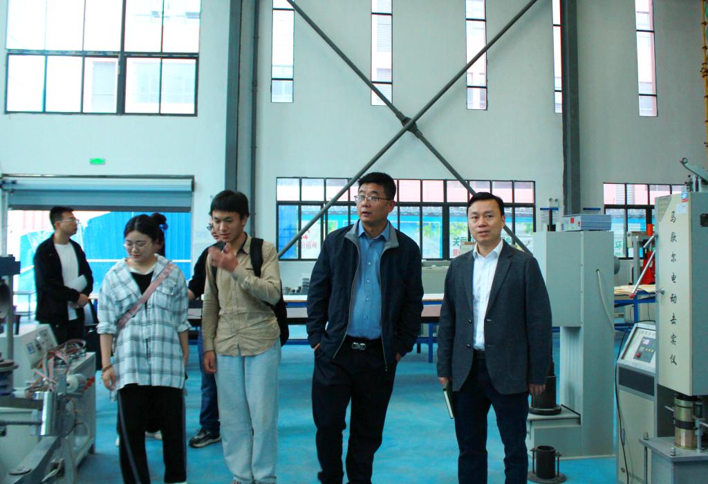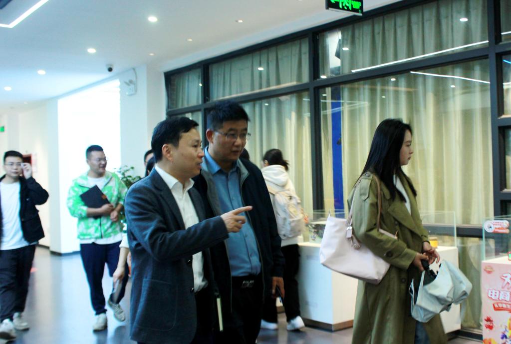 陈军一行参观了工程训练中心和数字云创基地。苟延杰就我校在学科、平台和人才等方面的优势进行介绍。