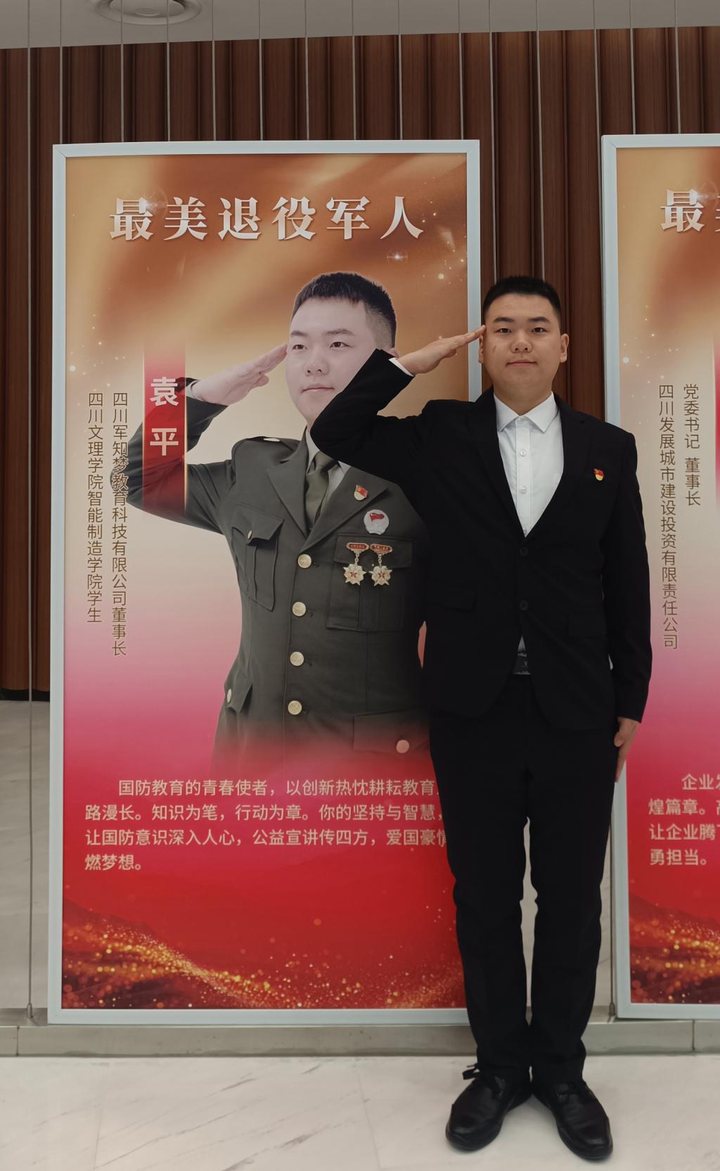 近日,由省委宣传部、退役军人事务厅、省军区政治工作局、省双拥工作领导小组办公室联合主办的四川省“情系国防”先进典型发布仪式在成都举行,现场发布了2024年度20名四川省“最美退役军人”和10名四川省“最美拥军人物”。我校大学生创新创业俱乐部第10批孵化入驻项目《国防教育军警课》负责人袁平,获评四川省“最美退役军人”。