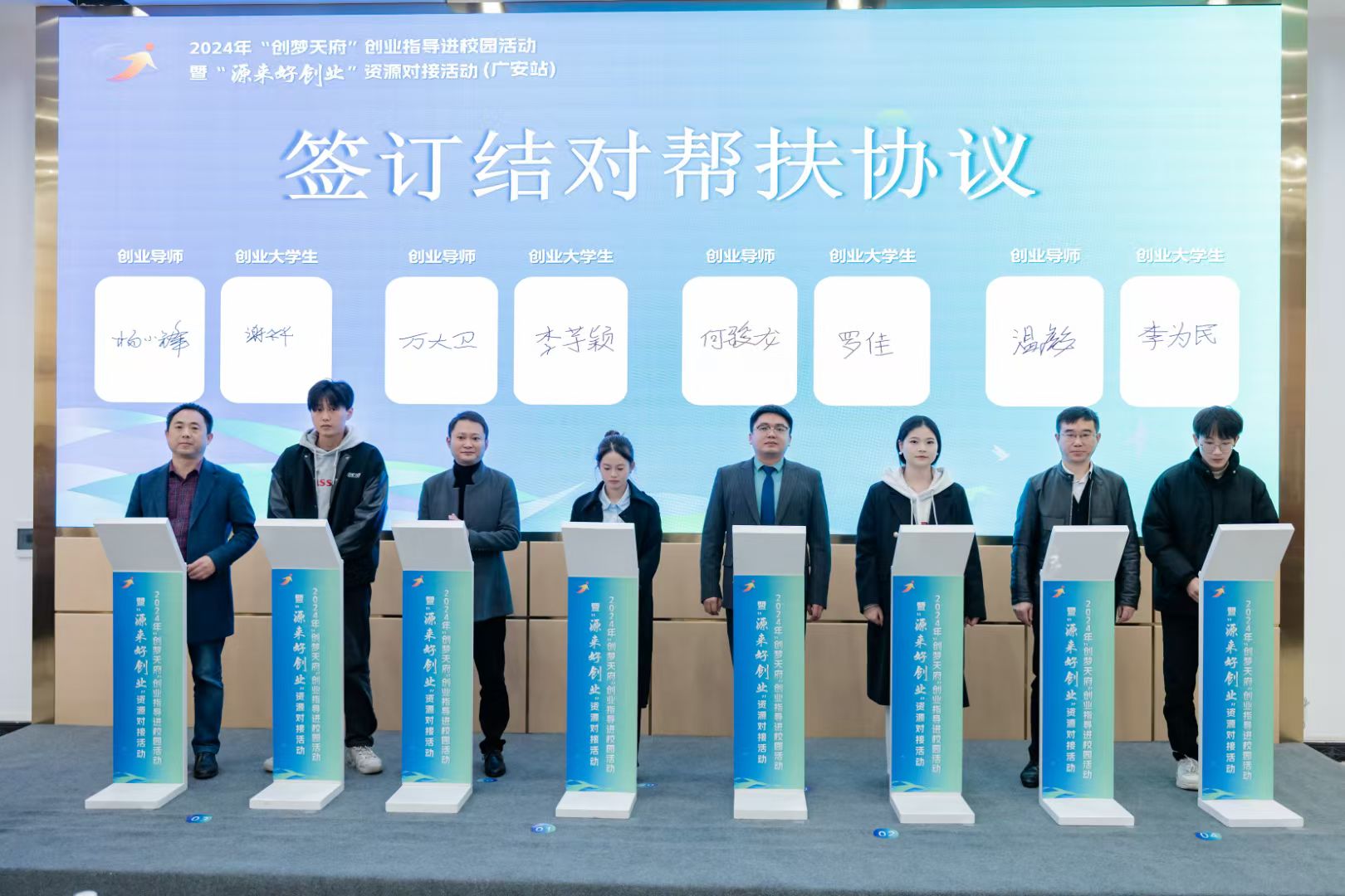 在启动仪式上,万大卫等八位创业导师被聘为广安市创业导师,并与广安职业技术学院创业学子签订了结对子帮扶协议。