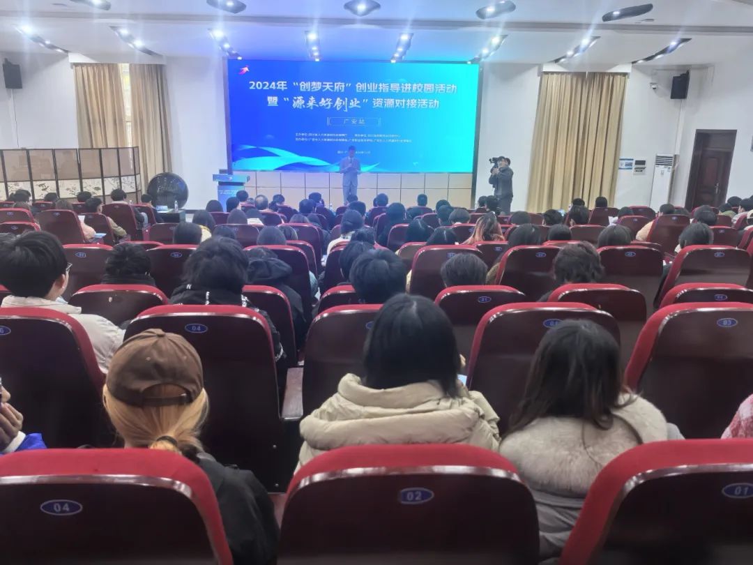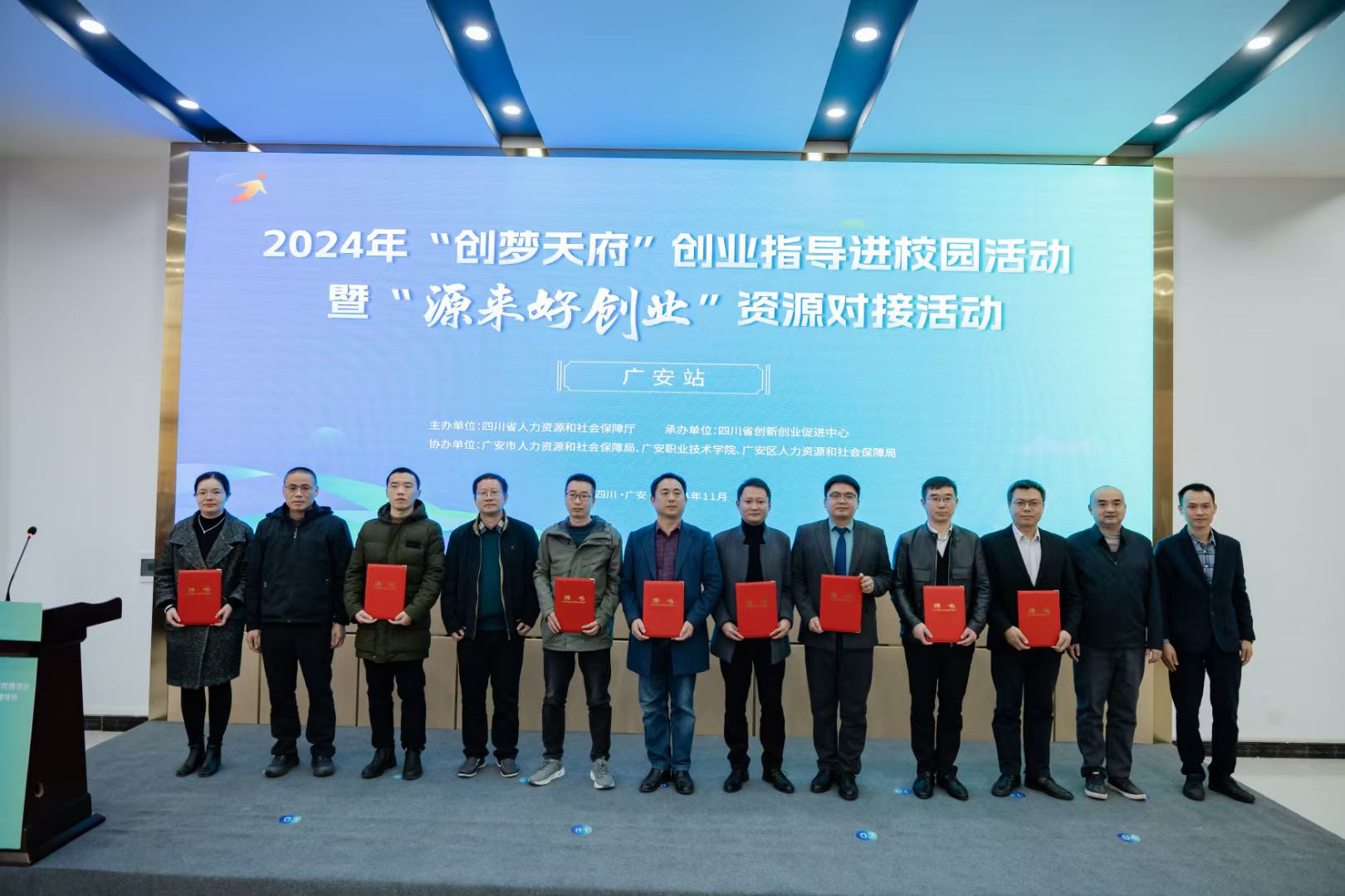 11月28-29日,2024年“创梦天府”(广安站)创业指导进校园暨“源来好创业”资源对接活动在广安职业技术学院举行。省创新创业促进中心、广安市人力资源和社会保障局、广安市就业服务管理局、广安职业技术学院,各县(市、区)、广安经开区等就业部门负责人及在校大学生共计200余人参加,我院教师万大卫作为省级创业导师受邀出席。
