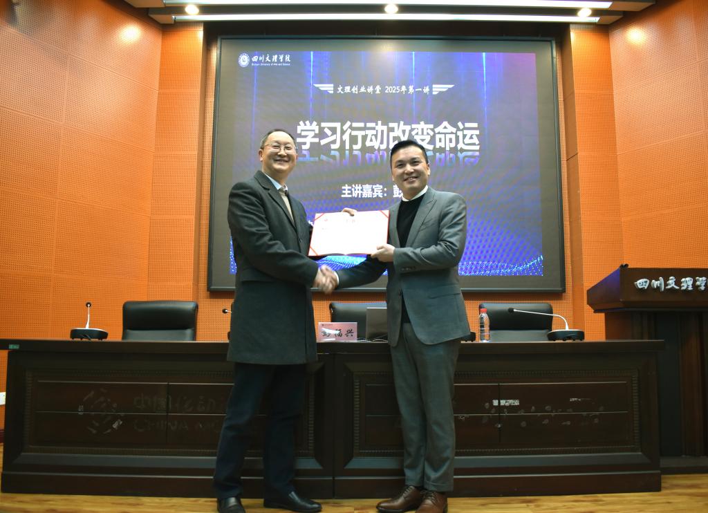 熊兴中代表学校为彭福兴颁发“williamhill官网大学生创新创业导师”聘书。陈磊代表学院致辞,他指出,我院依托“文理创业讲堂”旨在搭建校企对话平台,通过企业家“现身说法”,引导学生树立正确价值观、锤炼实干精神。他高度赞誉彭福兴扎根达州、服务民生的创业情怀,称其奋斗历程是“知识改变命运、行动铸就成功的生动教材”,勉励学予以榜样为镜,在时代浪潮中勇担使命。