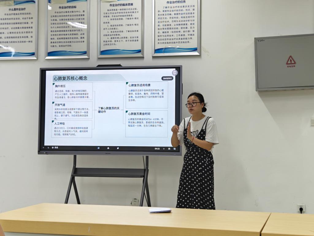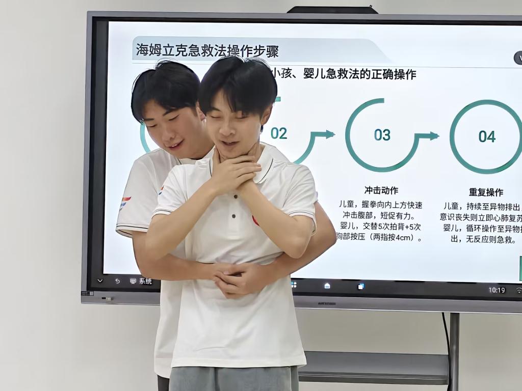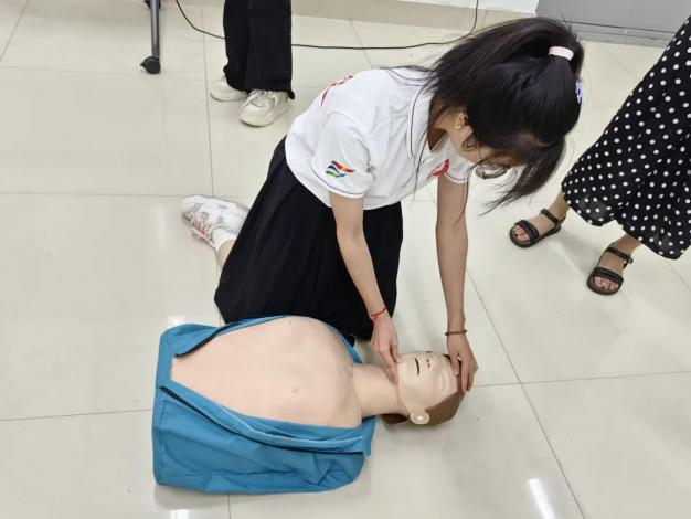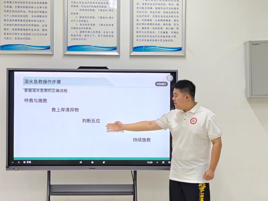 出征仪式结束后,康养产业学院教师刘孝英为团队成员作应急知识培训。她通过理论讲授、现场演示、互动实操的方式向同学们普及了心肺复苏、防溺水、海姆利克急救法等实用技能,同学们的实操能力显著提升。