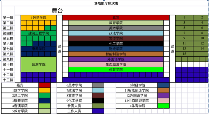 座次安排如下图:(马克思主义学院、政法学院座次区域合并,建筑工程学院、生态旅游学院座次区域合并。)